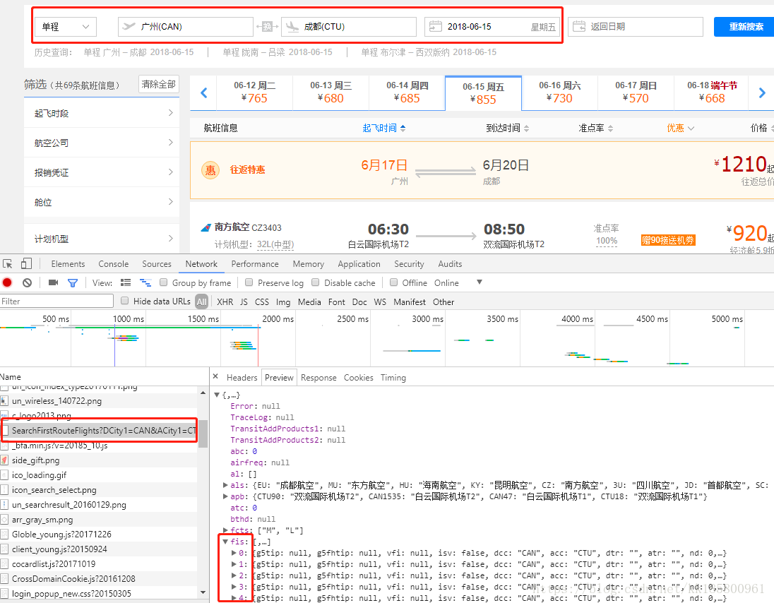 其中,CAN 表示广州,CTU 表示成都,日期 “2018-06-15”就比较明显了。一般的爬虫,只有替换这几个值,就可以遍历了。但观察发现,有个链接可以看到当前网页的所有json格式的数据。如下