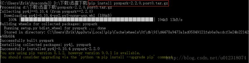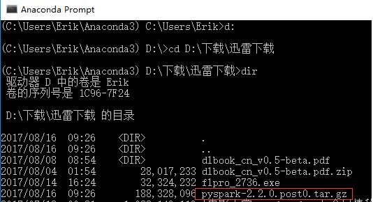 下载好后就可以离线安装 Python 包了,还是打开 Aanconda Prompt ,然后切换到存放pyspark-2.2.0.post0.tar.gz的目录文件,我的路径是D:\下载\迅雷下载