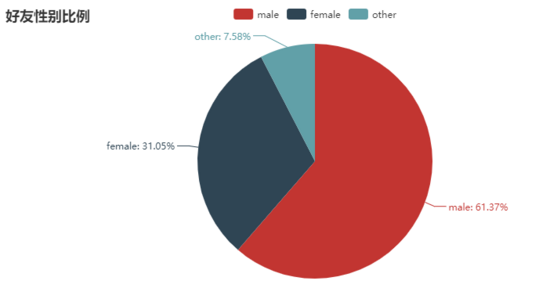 我们就来进行一些简单的的数据抓取,清洗与呈现。我看中的字段是:Sex、City、Province、Signature。我想做的是通过图表来直观地展示我微信好友中的 性别比例 , 家乡分布 (当然不一定准确,很多人都是胡乱设置的), 我的江苏朋友的市级分布 ,以及 好友个性签名的词云 。这部分内容主要是需要熟悉诸如pyecharts、jieba、wordcloud模块的API调取,难度不大,但需要细心调试。我这里就不详细赘述了,有疑问可以在评论区讨论。