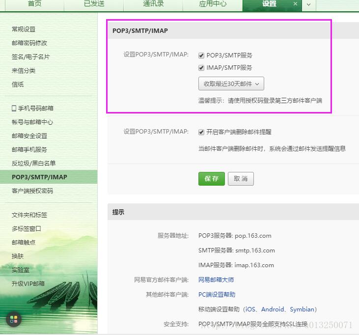 0.如果使用第三方邮件服务器SMTP服务来发送邮件,首先要在邮箱设置里面开启POP3/SMTP/IMAP服务,下面以163邮箱为例,其它邮箱设置方法相同