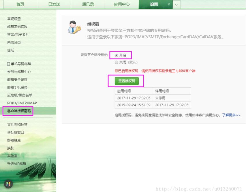 2.然后开启并获取客户端授权码(这里的授权码并不是登录邮箱时的密码,而是第三方邮箱服务使用的授权码)