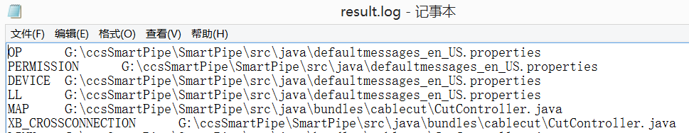 1.笔者使用该程序对java项目中的源文件内容进行关键字的搜索。程序入参为该项目本地文件系统路径G:\ccsSmartPipe\SmartPipe\src\java。