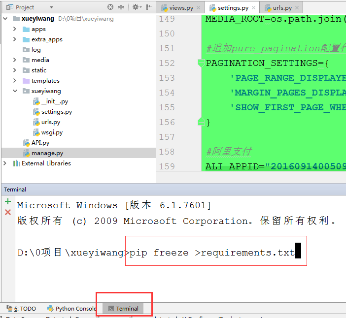 1.打开Terminal终端,执行以下命令,将项目所需要的依赖包,都记录到一个文件内备用。