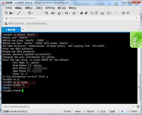 adduser ubuntu #设置密码 #确认密码 #设置姓 #设置名 #设置电话 #设置家庭电话 #除了密码以为,其他的这些信息用处不大 y+回车 cd /home #切换到家目录下 ls #查看家目录下的目录,可以看到ubuntu的目录已经建立
