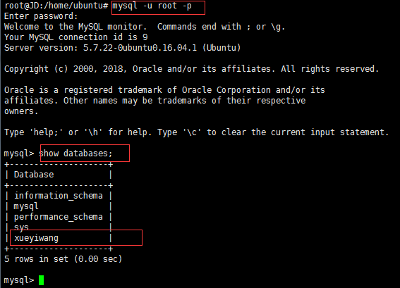 mysql -u root -p show databases;#查看所有数据库 quit #退出数据库