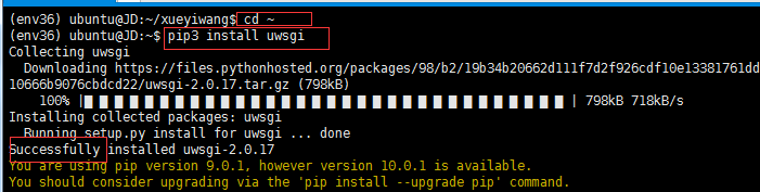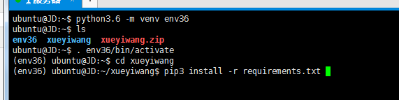python3.6 -m venv env36 #在当前目录下,创建一个python3.6的虚拟环境,取名为env36,目前自带虚拟环境只支持到3.6.2 . env36/bin/activate #进入虚拟环境 #退出虚拟环境 deactivate cd xueyiwang pip3 install -r requirments.txt #安装相关依赖包,其中requirments.txt,是在客户端时,通过pip freeze > requirments.txt获得 #这个过程也许需要多等一会,比较low一点的云服务就慢一些,亲身体验,bat里,百度的最慢 #有可能pip要升级,如果版本过时,会提示用户更新命令的