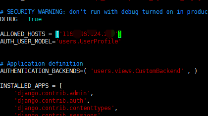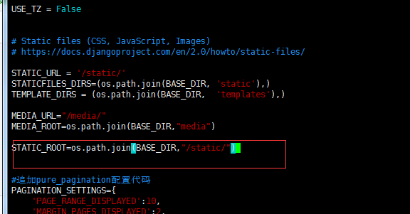 #进入settings.py文件中,点击i键,变为编辑模式 #通过上下左右键移动光标 ALLOWED_HOSTS = ['公网ip'] #在最底追加 STATIC_ROOT=os.path.join(BASE_DIR,"static/") #然后敲Esc键,输入:wq 保存退出