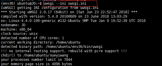 [uwsgi] chdir=/home/ubuntu/xueyiwang module=xueyiwang.wsgi:application home=/home/ubuntu/env36 master=true processes=10 socket=:8001 chmod-socket = 666 vacuum=true