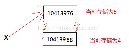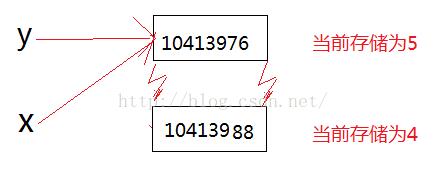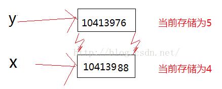 也就是说在执行x = 4,y = 5之后,x,y分别指向了不同的地址,当执行 x = y之后: