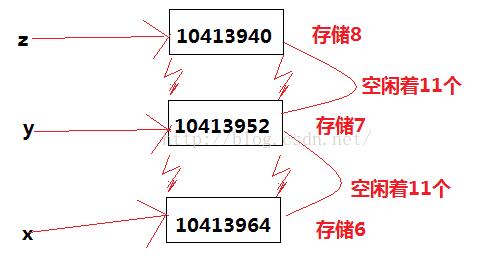 也就是说,x指向了y所指向的内存了,这里我们知道,它们都指向同一块内存