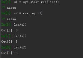 sys.stdin.readline( )会将标准输入全部获取,包括末尾的'\n',因此用len()计算长度时是把换行符'\n'算进去了的,但是raw_input( )获取输入时返回的结果是不包含末尾的换行符'\n'的。