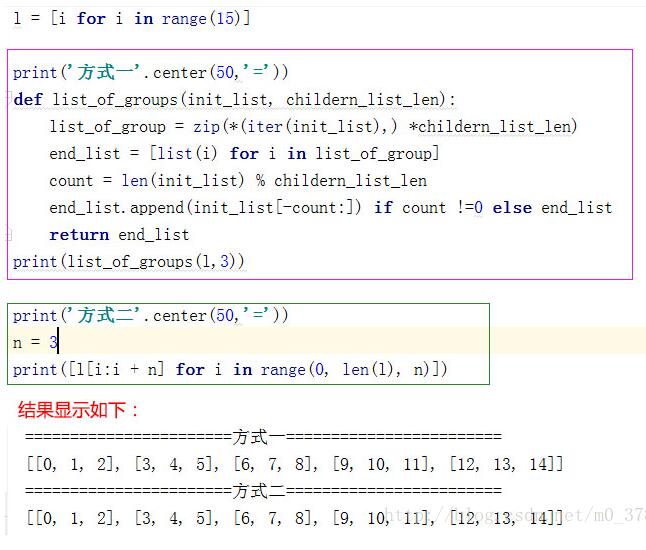 l = [i for i in range(15)] n = 3 #大列表中几个数据组成一个小列表 print([l[i:i + n] for i in range(0, len(l), n)])