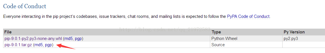 1.在这里下载pip的更新版本,选择箭头所指的文件下载到你电脑的某处并解压。如果从官网下载失败,也可以下载我的这个。
