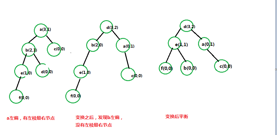 假定a左偏,就需要一个比a小的最少一个值d(因为d唯一 一个是比a小,而且比a的左枝所有数都大的值)做父集结点,a做d的右枝,这样在最上面的d节点就平衡了。