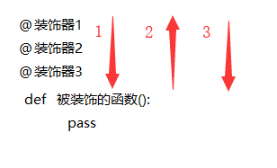 对于装饰器来说,在这里程序从上到下执行,开始记录装饰器1-3,然后读到了函数的时候,装饰器开始装饰,把函数的引用传入装饰器中,从装饰器3开始往上装饰,所以这时候开始执行装饰器3的初始化,并把装饰完的函数当做一个新的函数,再次把新的引用传入到装饰器2,接着装饰器2进行初始化,再次把新的函数的引用传入到装饰器1进行装饰,这时候装饰器1的初始化开始,并开始执行,从而接下来的执行顺序为1-3执行装饰的内容,最后再执行本来的函数,达到一个对原有函数增加功能和特性的要求。