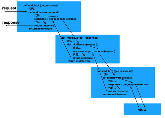 在中间件中,执行顺序等同,只不过中间件装饰的是视图函数或者是试图类,会有一个init()初始化,为了便于理解我在说明装饰器顺序的时候,那里说的初始化就是现在的init(),也就是中间件在执行上也是从最接近函数或者类的中间件开始初始化,在中间件注册时,如果有多个中间件,程序按照从上到下的顺序来确认中间件,接着执行视图函数的时候,开始从下到上的进行init(),这里的初始化init()类似于Flask框架里四种请求勾子中的请求开始前执行一次的意思,从下到上执行完init后,再从上到下执行请求前所要执行的代码,请求完成后再从下往上执行请求后的代码。