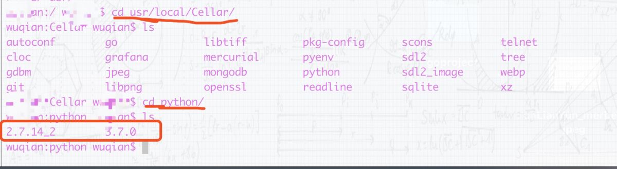 cd usr/local/Cellar/ //到此目录下 cd python/ //进入python目录下 查看已安装的python版本,如果有2.x 和 3.x说明安装成功
