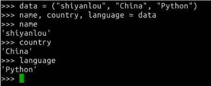 >>> data = ("shiyanlou", "China", "Python")