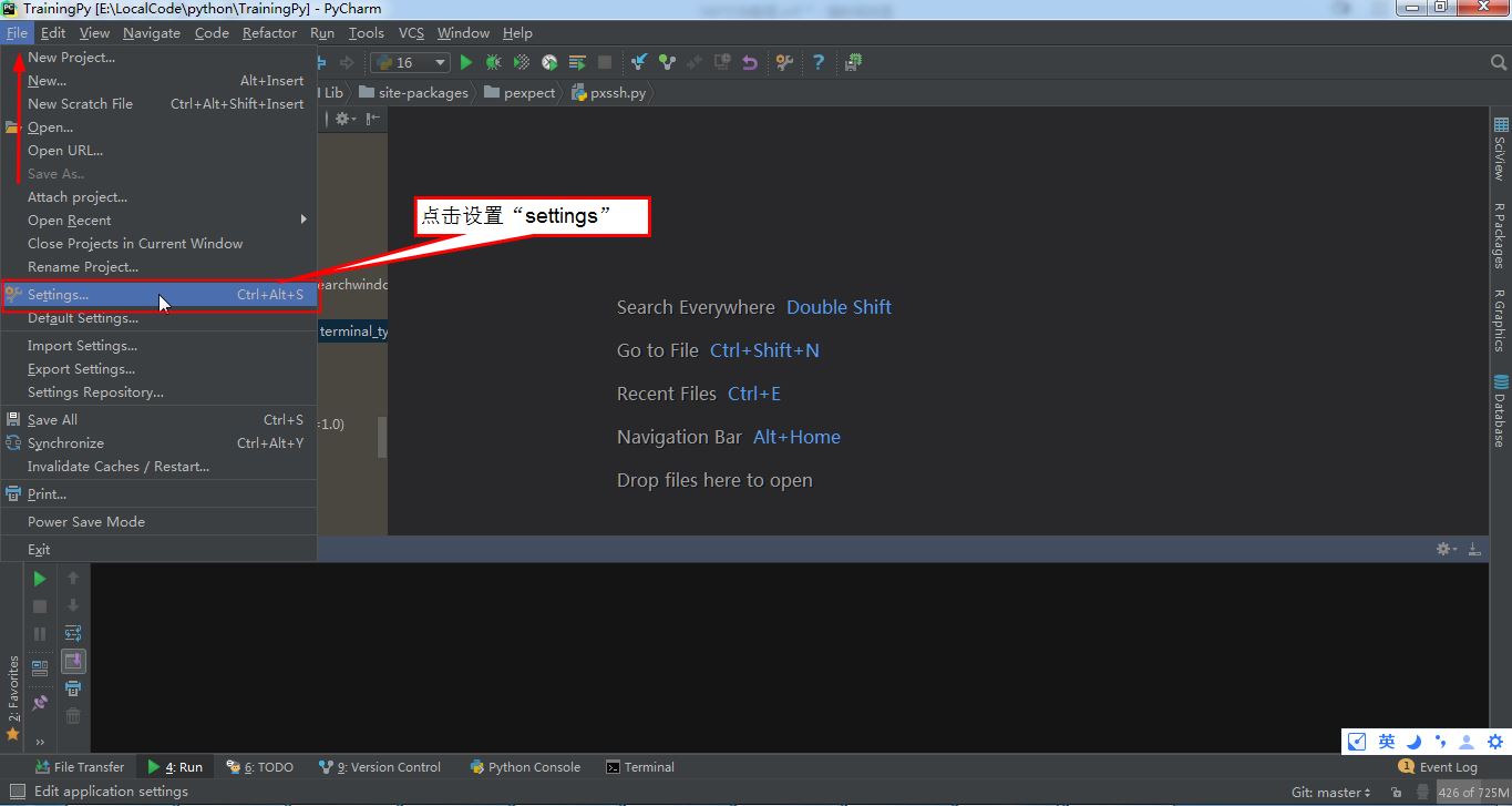 第一步:运行PyCharm,然后点击设置如下图