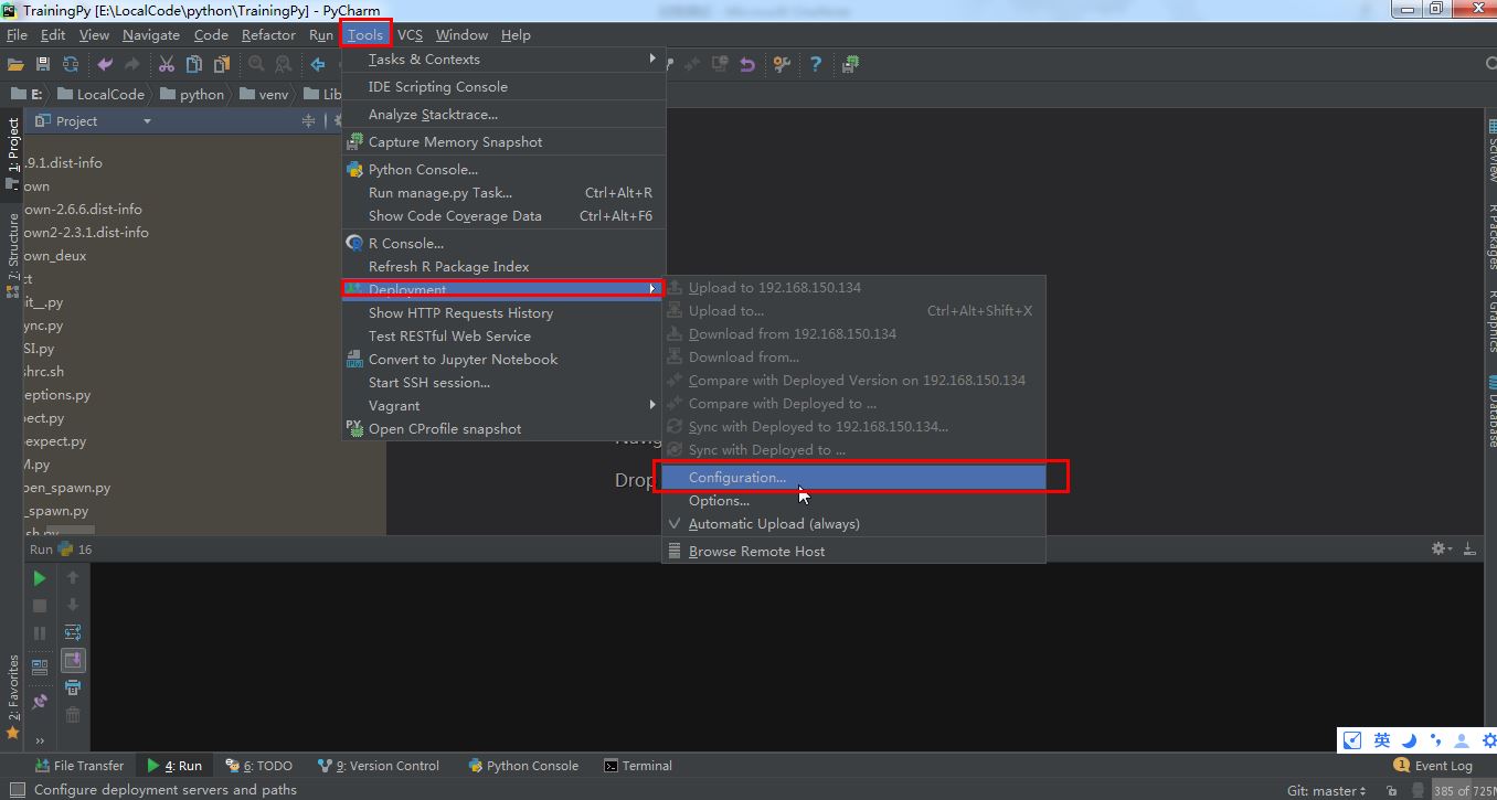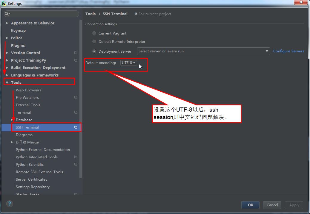 ----> File --> settings --> SSH Terminal --> Deployment server: 此处是你所使用的环境, Default encoding: utf-8