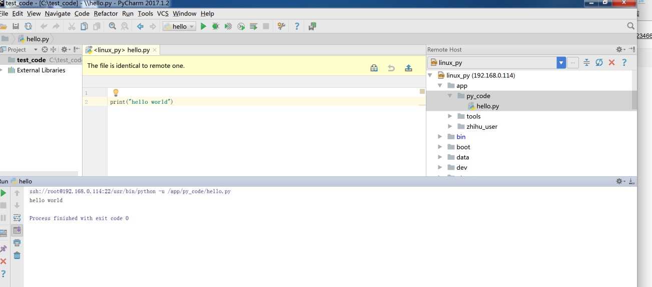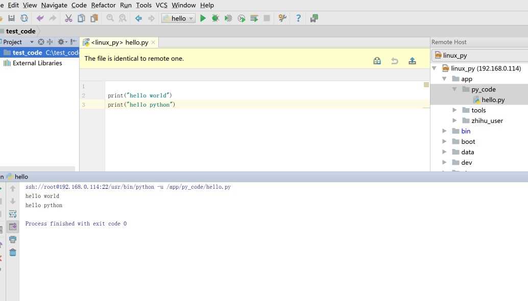 我在远程linux上新建了一个hello.py文件,并打印hello world