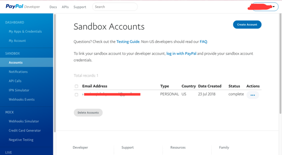 点击进入 dashboard 界面,点击 sandbox 下的 account 选项,我们可以在此创建一个测试账号。
