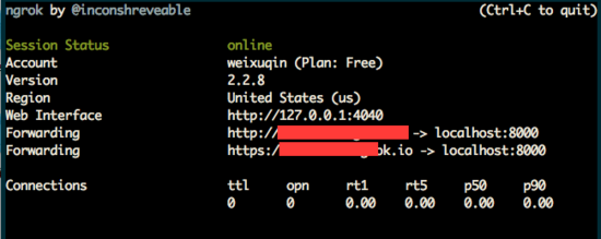 这个命令将在 8000 端口为本地主机创建一个通道并为其设置一个网络可以访问的主机名称,得到以下输出:
