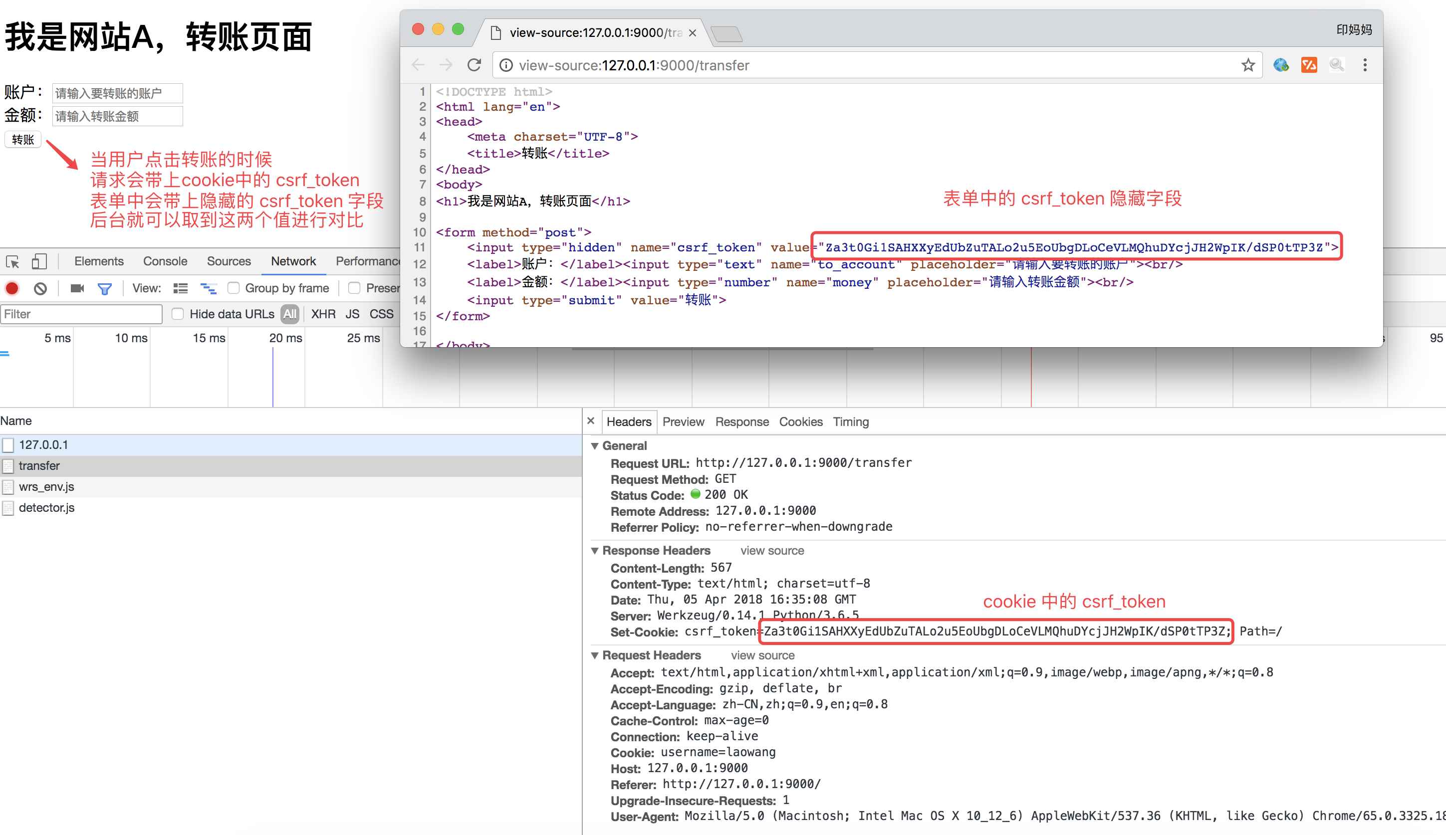 在网站A中模拟实现 csrf_token 校验的流程