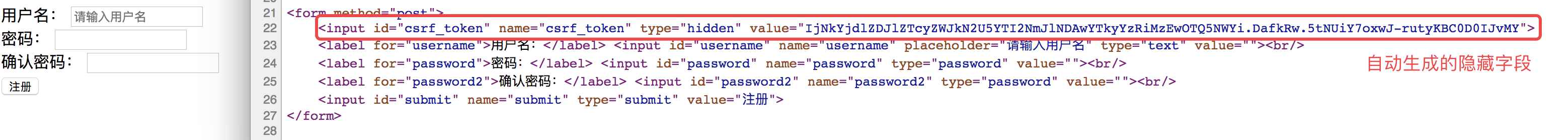 2.在 Form 表单中添加一个隐藏的的字段,值也是 csrf_token
