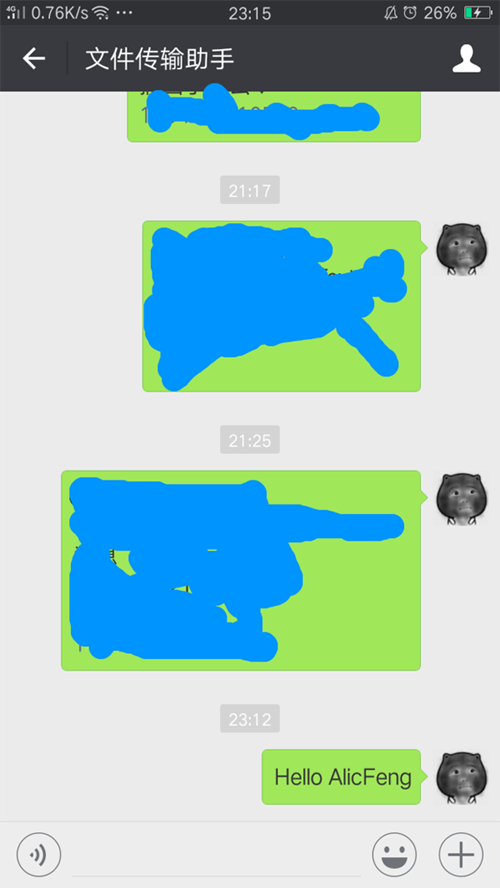 itchat.send('Hello AlicFeng', toUserName='filehelper')