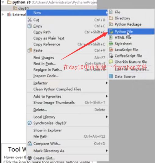 然后就是点击OK就可以建立一个.py文件,这样以后还可以在day10中再建立很多python文件,然后还可以在python全站-s3中建立day11,day12等,方便以后自学python