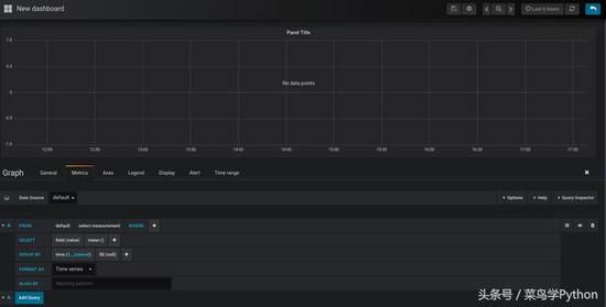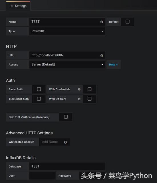 其中,name自行设定;Type 选择InfluxDB;url为默认的http://localhost:8086, 其他的因为我前面没有进行配置,所以默认的即可。然后在InfluxDB Details里的填入Database名,最后点击测试,如果没有报错的话,则可以进入下一步的展示数据了;