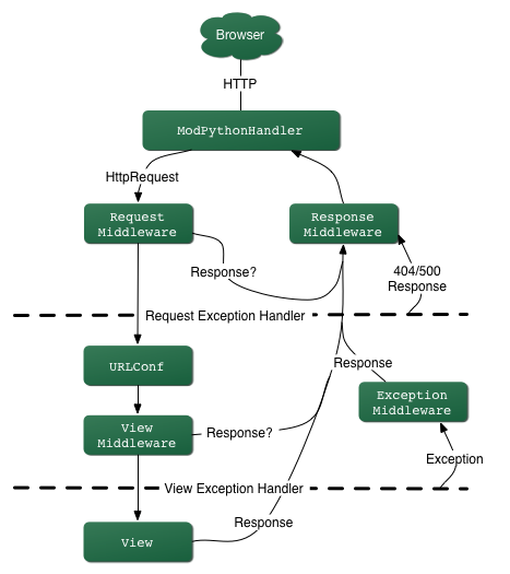 Celery是一个基于python开发的分布式任务队列,如果不了解请阅读笔者上一篇博文Celery入门与进阶,而做python WEB开发最为流行的框架莫属Django,但是Django的请求处理过程都是同步的无法实现异步任务,若要实现异步任务处理需要通过其他方式(前端的一般解决方案是ajax操作),而后台Celery就是不错的选择。倘若一个用户在执行某些操作需要等待很久才返回,这大大降低了网站的吞吐量。下面将描述Django的请求处理大致流程(图片来源于网络):