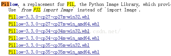 (2)搜索PIL(ctrl+F),找到下面的图片所示,如果你的python是2.7版本就下载cp27的,3.5就下载cp35