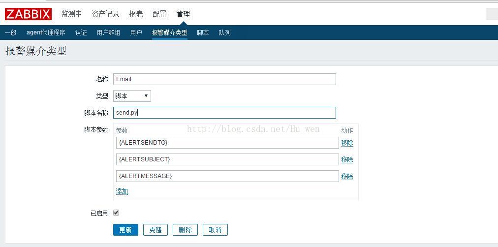 在zabbix管理中添加报警媒介类型,注意parameter中的值一定要写入,注意script name中的脚本文件名字,要和刚刚编写的Python文件名一致