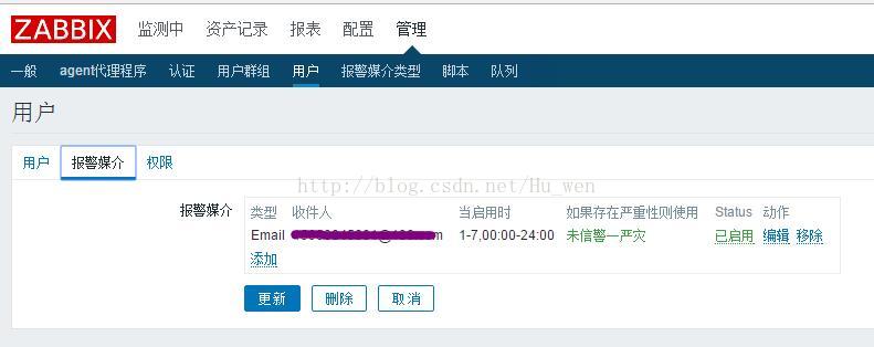 配置用户,修改报警媒介,填写收件人邮箱,选择发送邮件告警类型。