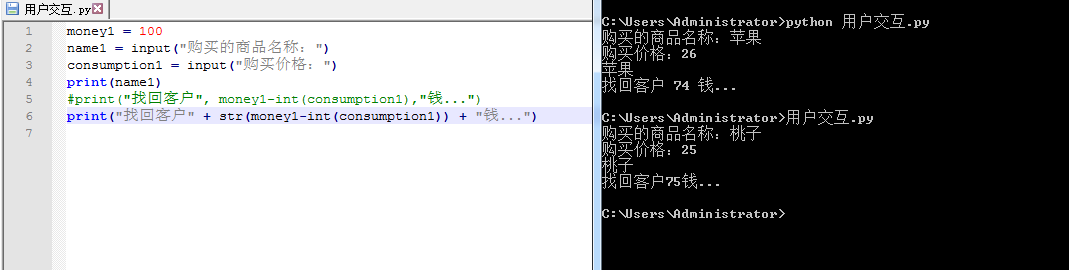print("找回客户" + str(money1-int(consumption1)) + "块") #计算剩余多少钱,加号连接, 他们是一个整体,所以每个部分都要转换为字符创串的形式才可以相加,输出。