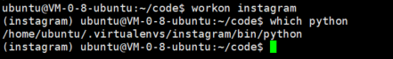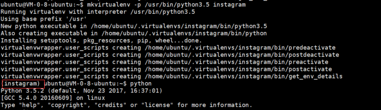 第六步:创建自己使用的虚拟环境具体指令说明不过多说明:mkvirtualenv -p /usr/bin/python3.5 instagram