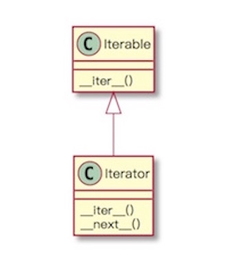 迭代器实现__iter__,因此所有的迭代器都是可迭代的,下图展示了iterable和iterator的结构。