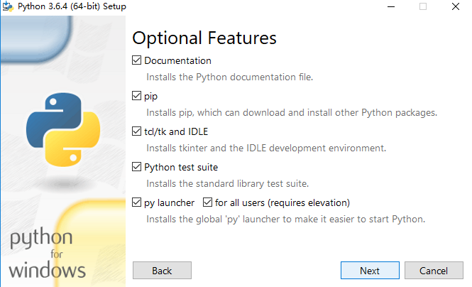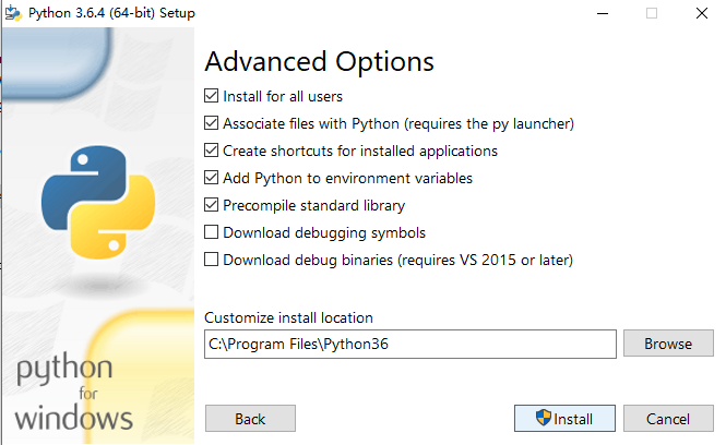 双击Python的.exe安装程序, 勾选Install launcher for all users和Add Python 3.6 to PATH,,并选择自定义安装(Customize installation)