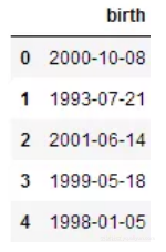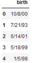data = {'birth': ['10/8/00', '7/21/93', '6/14/01', '5/18/99', '1/5/98']}
