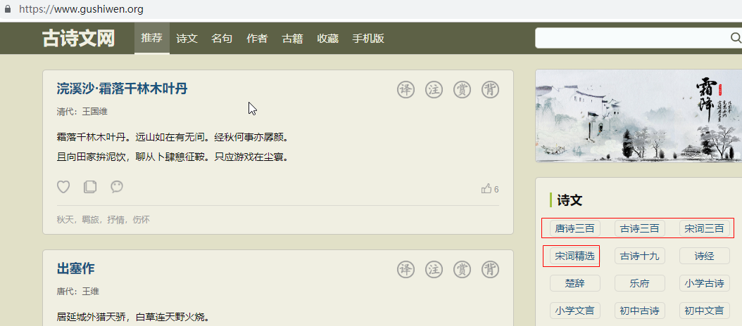 首先,我们利用Python爬虫来爬取诗歌,制作语料库。爬取的网址为:https://www.gushiwen.org,页面如下:
