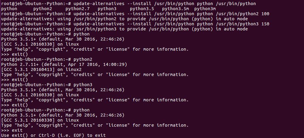 sudo update-alternatives --install /usr/bin/python python /usr/bin/python2 100sudo update-alternatives --install /usr/bin/python python /usr/bin/python3 150