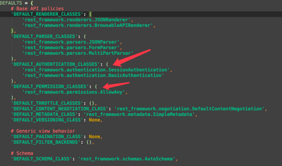 上面给出的是权限配置的默认方案,写和不写没有区别。 rest框架有自己的settings文件 ,最原始的默认值都可以在里面找到: