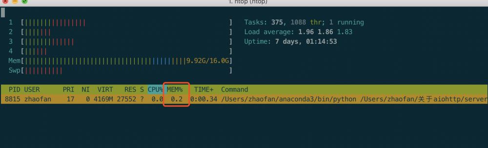 因为我的代码是在linux上跑的,或者mac上我们都可以通过htop非常方面的实时查看我们程序内存的占用情况,我们先将服务端启动,查看一下我们此时的内存情况可以看到占用的