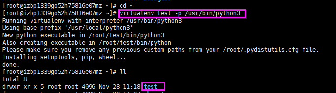# cd ~ # virtualenv 虚拟黄环境名 -p /usr/bin/python3