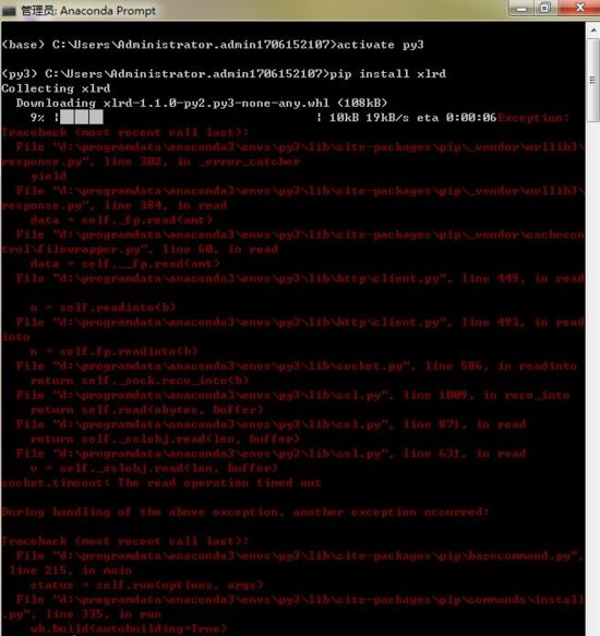 当我们在cmd窗口中使用命令:pip install 包名.文件格式 时候常常会出现安装失败的现象,你会看到下载的进度条,但是最后显示当下载到百分之几十的时候窗口中就会出现一堆红字,有如下类似提示: