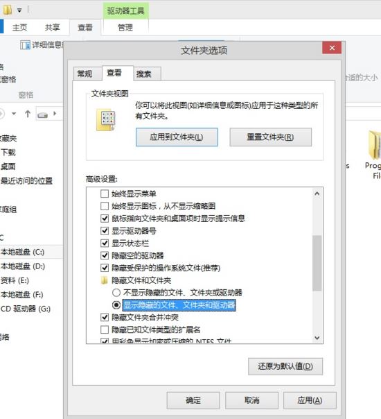 打开c盘,点击左上角的“查看”-“选项”(文件夹选项)-勾选“显示隐藏的文件”,然后确定即可。这样你就能看到AppData文件夹了。(如下图)