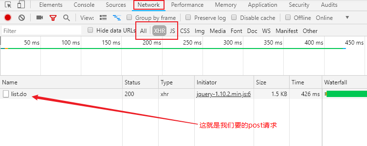 由于post请求很多时候是配合Ajax(异步加载)技术一起使用的,我们抓包时,可以直接选择XHR(XmlHttpRequest)-ajax的一种对象,帮助我们滤掉其他的一些html、css、js类文件,如下图所示(截取自Chrome):
