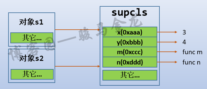 但因为s1、s2连接到了supcls类,所以可以进行对象属性查找,如果对象中没有,将会向上找到supcls。例如: